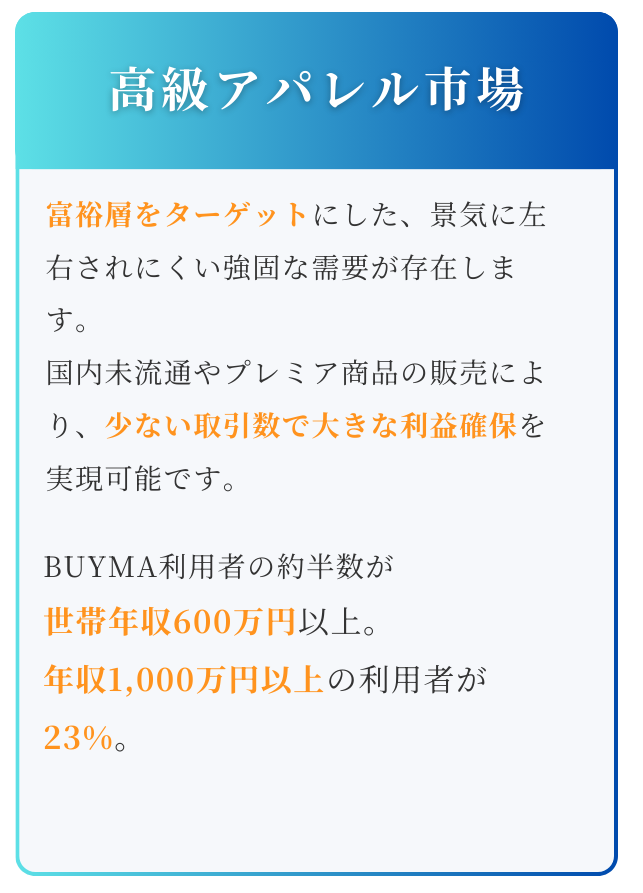 世界中のパーソナルショッパーから購入できる独自のプラットフォーム。ファッション感度の高いユーザーが集まる高単価市場です。稼いでいる人だけが知る「無限の可能性」があります。